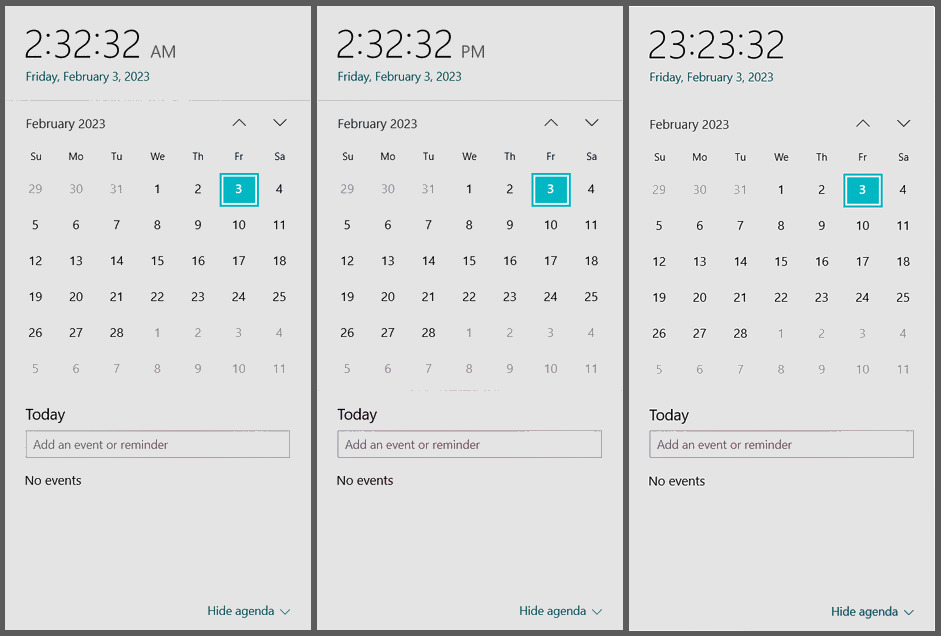 | Friday | 2/3/23 | 23:23:23 (Military) |