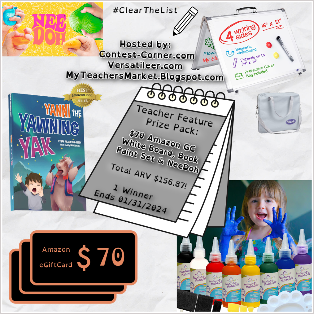Rules, regulations, and other important stuff: Giveaway is hosted by Contest Corner, Teacher’s Market and Versatileer is open to US residents 18 years of age and older. Winner has 48 hours to respond to our notification email, or a new winner will be chosen in their place. By entering this giveaway, you opt-in to receiving a one-time prize notification email only if you are the winner. Contest Corner will respond to winner’s confirmation and any related emails in order to coordinate prize fulfillment and, if necessary and feasible, follow up with winners who have not responded in a final attempt to make contact before re-drawing. One $25 Amazon eGift Card will be fulfilled by Contest Corner, one $20 Amazon eGift Card will be fulfilled by Teacher’s Market, one $25 Amazon eGift Card will be fulfilled by Versatileer, and the book, white board, paint set & NeeDoh products will each be fulfilled separately by the respective authors, companies and/or PR firms representing them. Blog Hop participants are not liable for any prizing they are not directly sponsoring & fulfilling. Contest Corner vets all sponsors and will make every effort to ensure winners get their prizes, but is not responsible in the unlikely event that there is an issue with fulfillment. Please see Contest Corner’s Privacy Policy, Terms and Conditions, Cookie Policy and Disclosure for further details on Contest Corner’s policies. Contest Corner team members are ineligible. Giveaway ends on January 31st, 2024 at 11:59 PM PST. Winner will be chosen through Rafflecopter on February 1st, 2024, notified via email, displayed on the Rafflecopter widget on all Blog Hop participant posts and announced on Contest Corner’s “Winners” page through a corresponding blog post and/or on other Blog Hop Participant blog posts or social media; the winner announcement and/or video footage of drawing the winner on Rafflecopter will also be shared on Contest Corner’s social media and email newsletter. The winner will be announced using the first name and initial as displayed in the Rafflecopter widget. Void where prohibited. This giveaway is in no way sponsored, endorsed or administered by, or associated with, Facebook, Instagram or Twitter, and by entering this giveaway, you completely release Facebook, Instagram and Twitter. Contest Corner is not responsible for late entries or entries lost due to technical malfunctions.