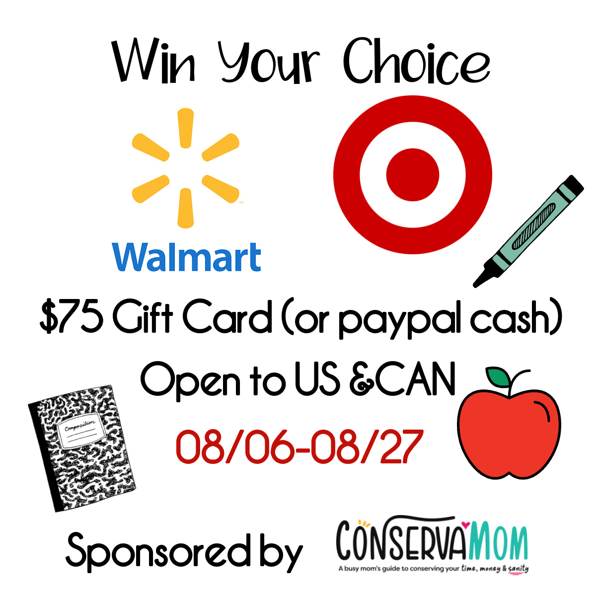 Disclosure: All opinions are 100% mine. This giveaway is in no way associated with, sponsored, administered, or endorsed by Visa, Facebook, Twitter, Google, Pinterest or any other social media network. All opinions and experiences are Conservamom‘s. Open to US  must be 18+. The Confirmed Winner(s) will be contacted through email and have 48 hours to respond before a new winner will be drawn. No purchase is necessary. Void where prohibited by law. The sponsor will be responsible for product fulfillment to the winner(s) of the giveaway. The disclosure is done in accordance with the Federal Trade Commission 10 CFR, Part 255 Guides Concerning the use of Endorsements and Testimonials in Advertising. For questions or to see your product featured in an Event you can contact  Elia At Conservamom8_27 win your choice.jpg