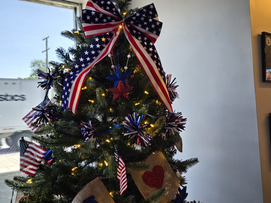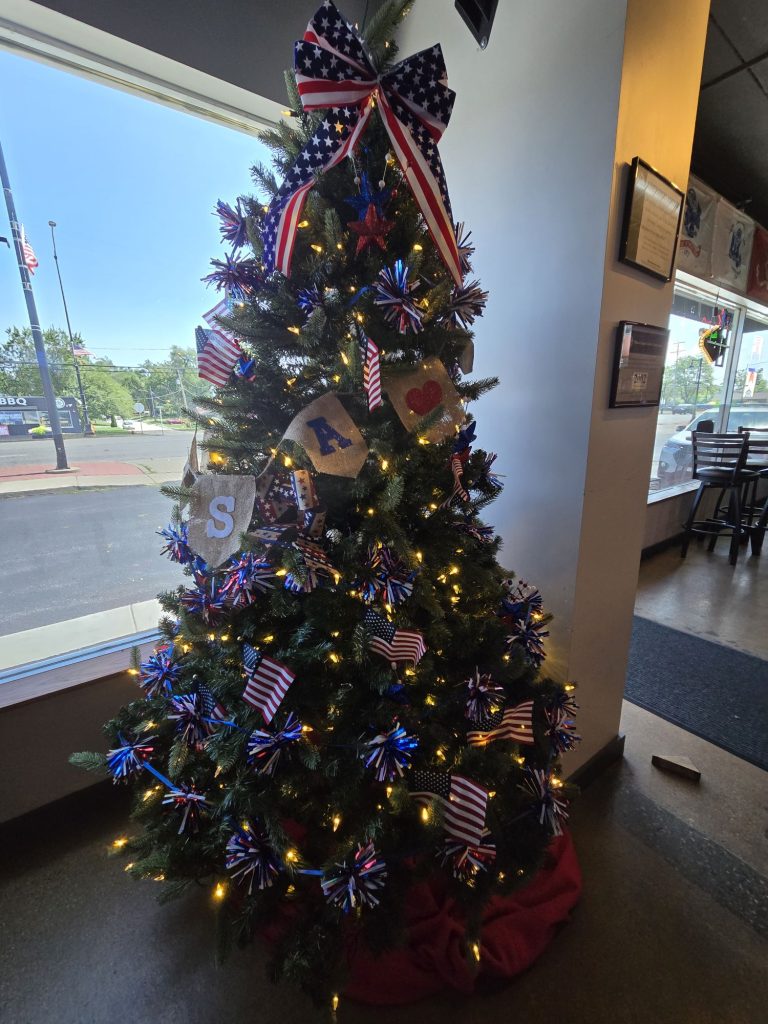 Location is “Style & Prestige Featuring a Red, White & Blue Tree at Cooper’s Bar and Grill in Oak Forest, Illinois” for Labor Day.