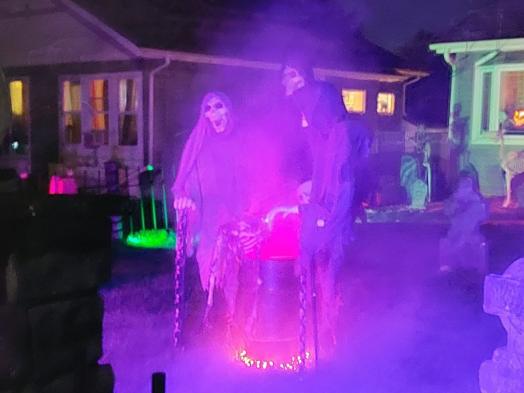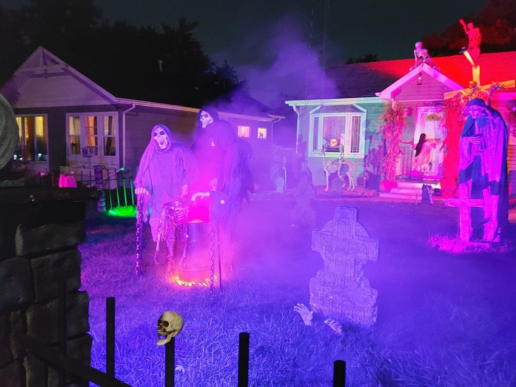 Display w/lit props including ghouls, tombstones, and various lighting scenarios, including fogging machines.