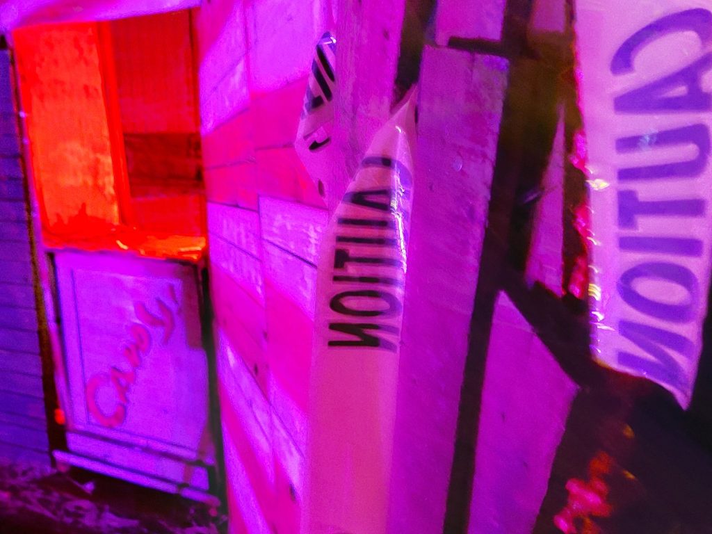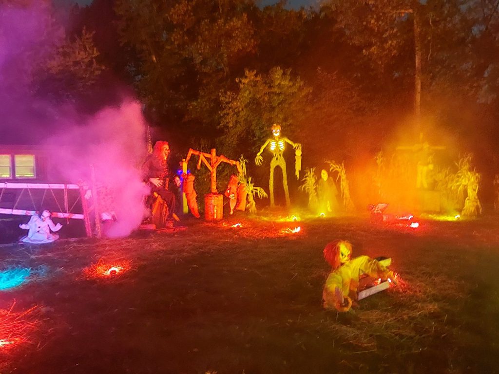 Walk Through Haunt with actors, clowns, and Is an interactive haunt with great scenery & nods to slasher classics. We try to capture horror genres that we feel make people the most uncomfortable. The outside display features major sound effects & Display w/lit props including tombstones, ghouls, and various lighting scenarios.