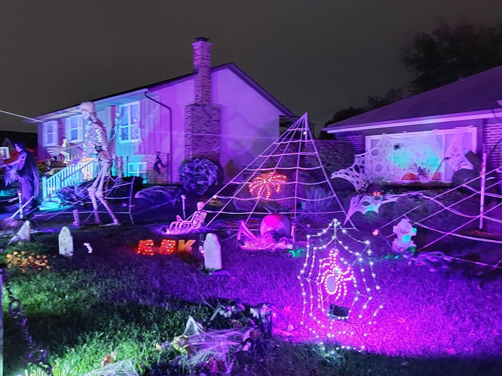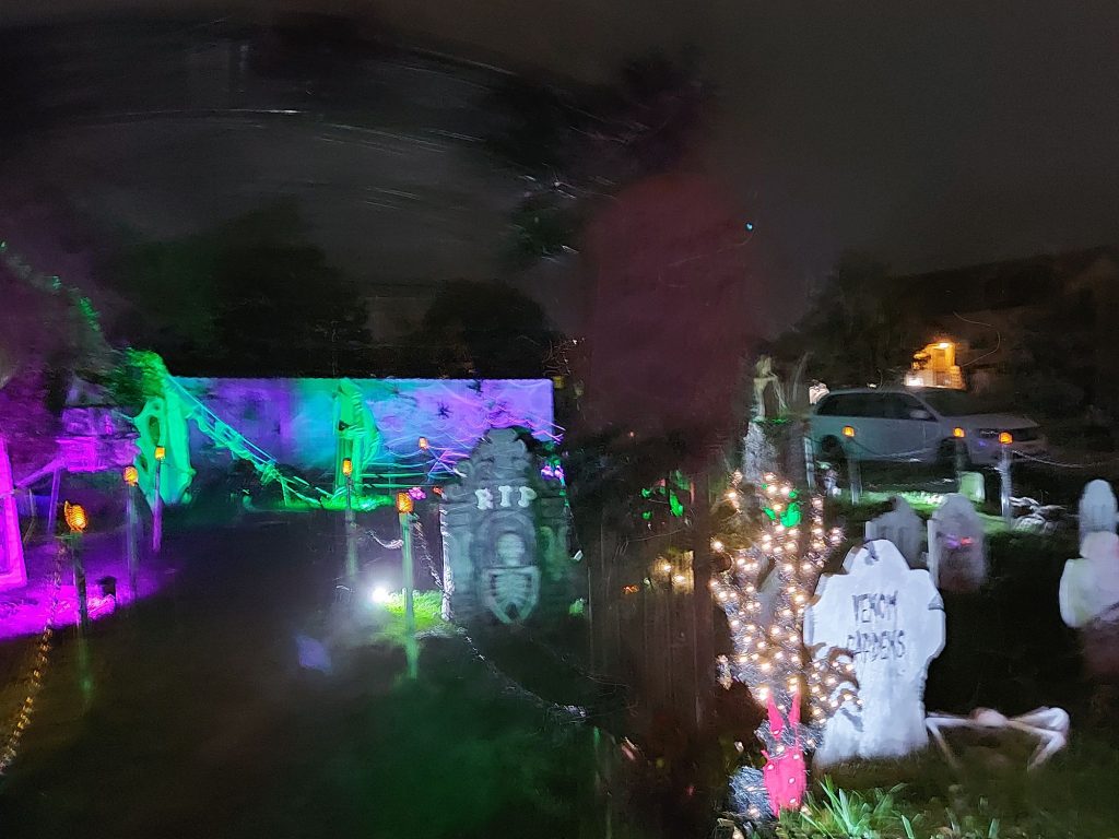 Display w/lit props including ghouls, tombstones, and various lighting scenarios. A scary graveyard with some surprises. (Known for throwing up skeleton)