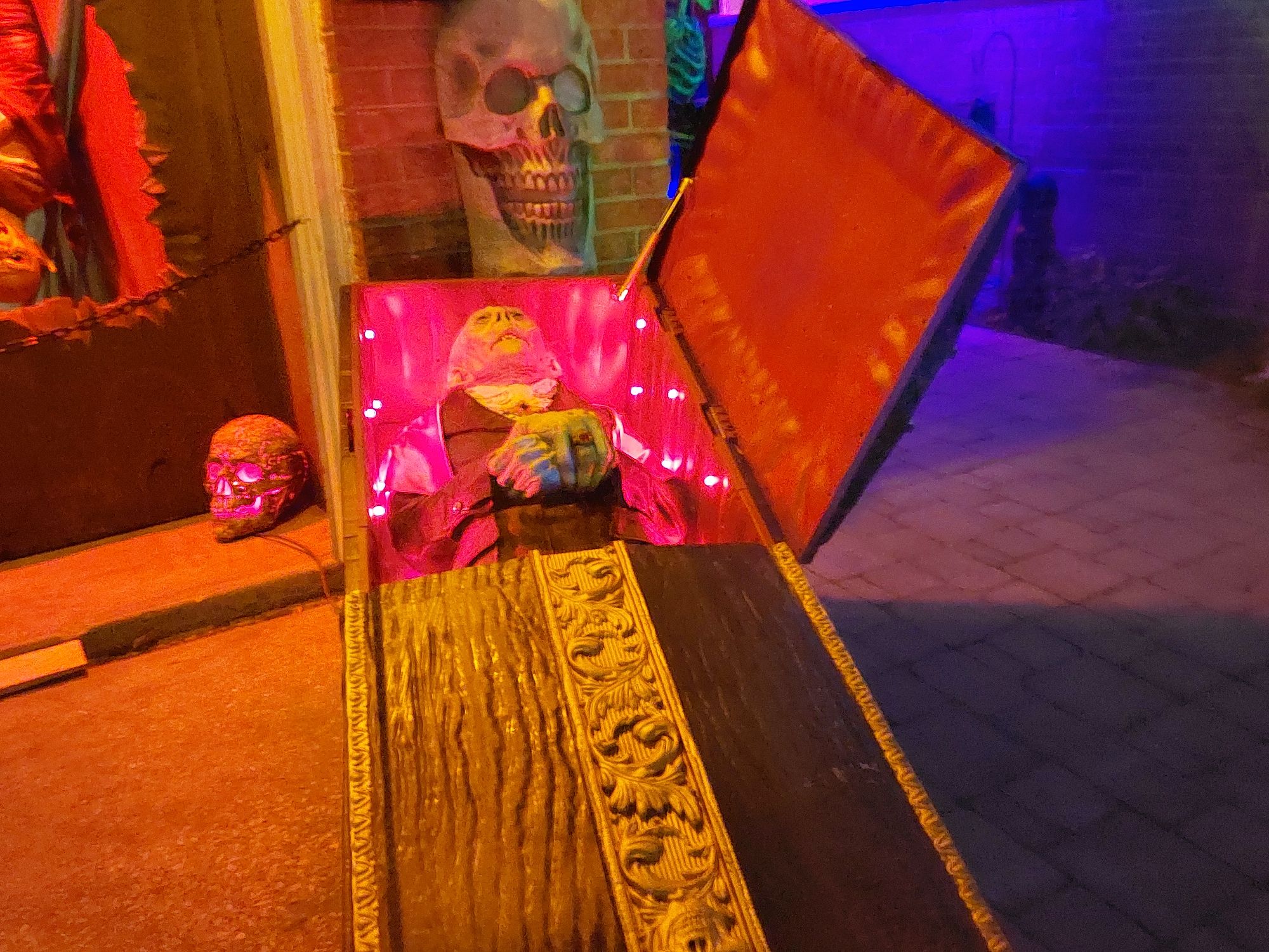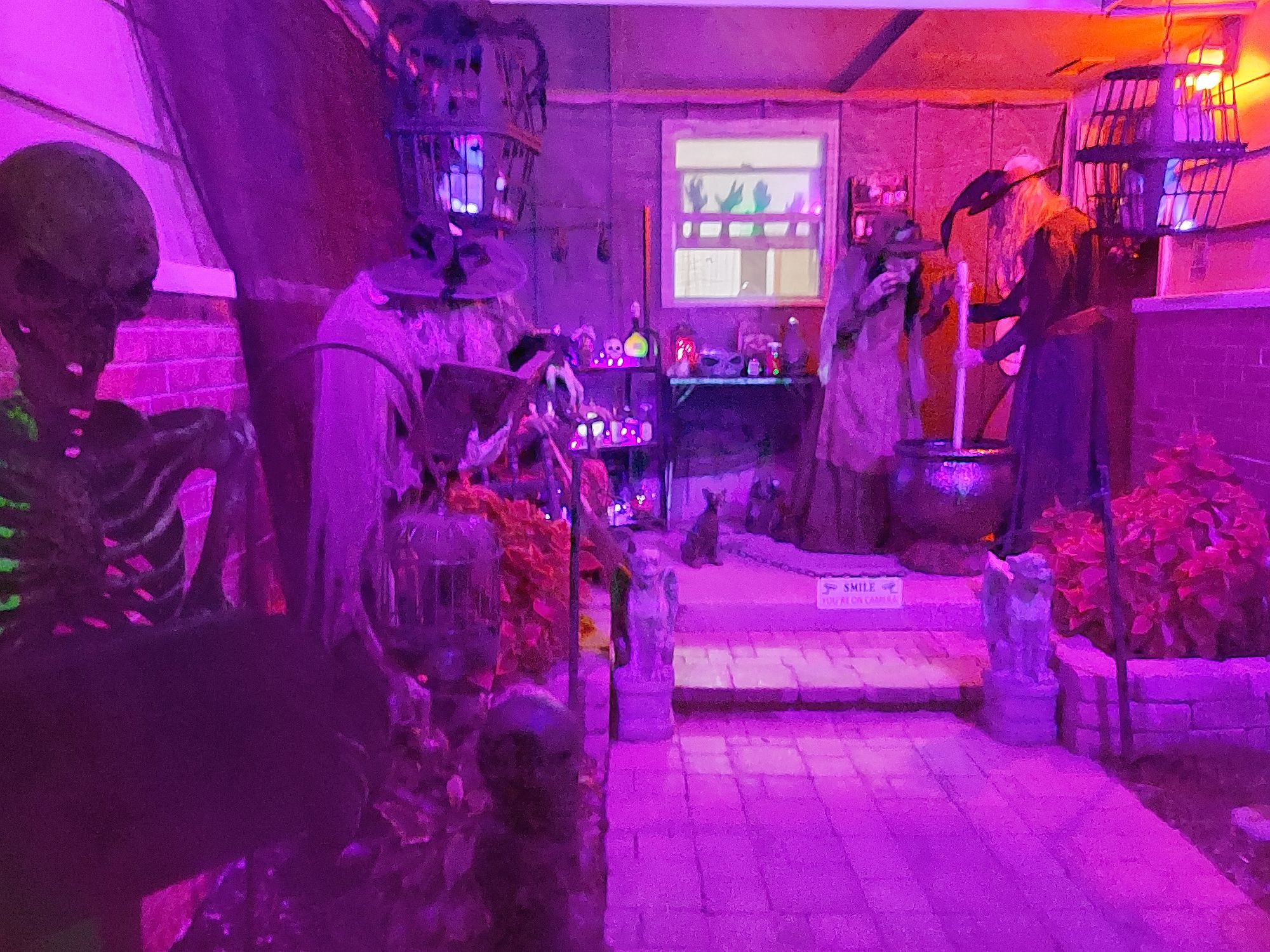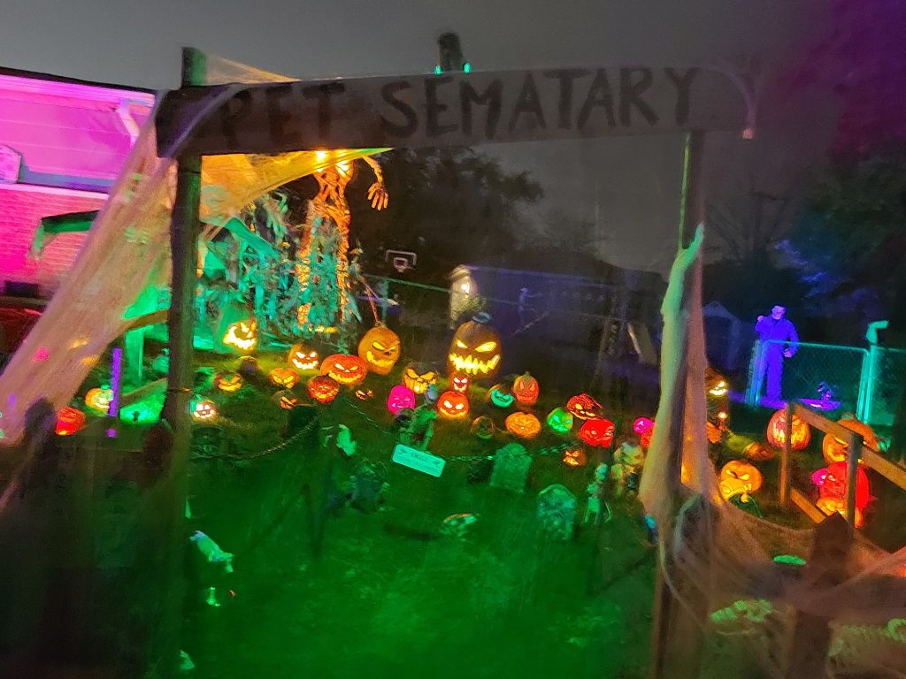 Display with A mix of creepy pumpkins, skeletons, graveyard, creepy and flashing lights, and fog, What started out as a fun little display has quickly grown into an obsession for the whole family. the interaction that comes with Halloween from neighbors and community, and The displays have grown.