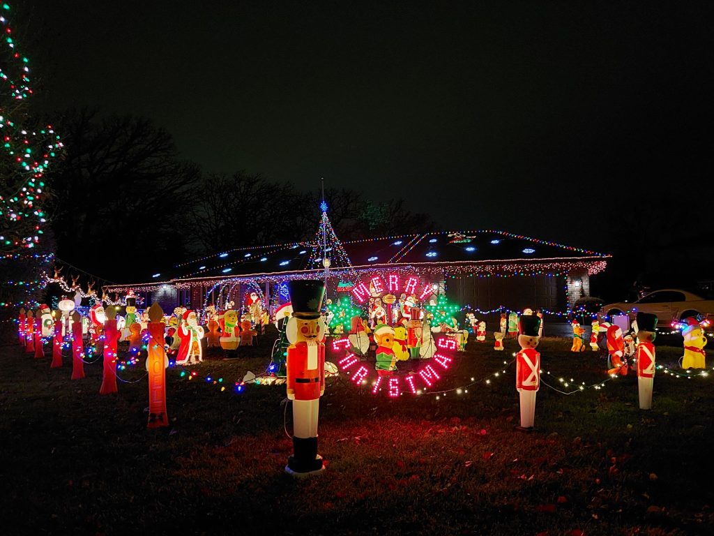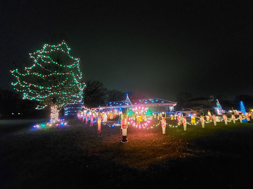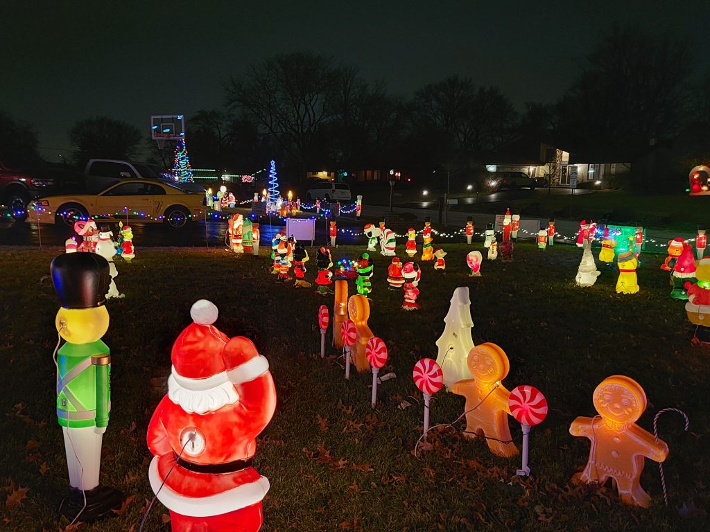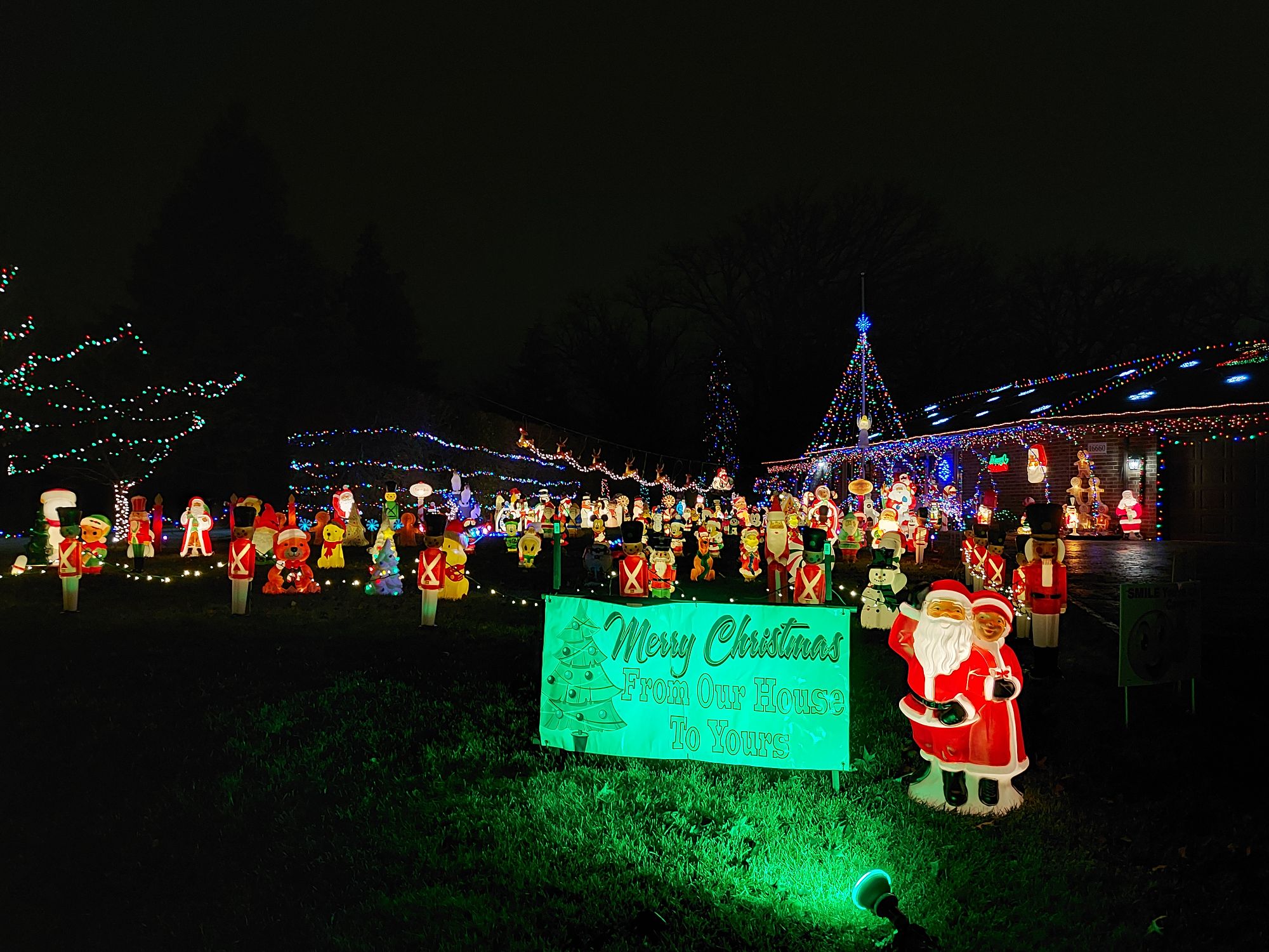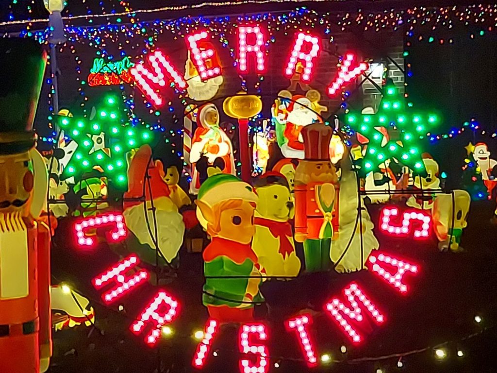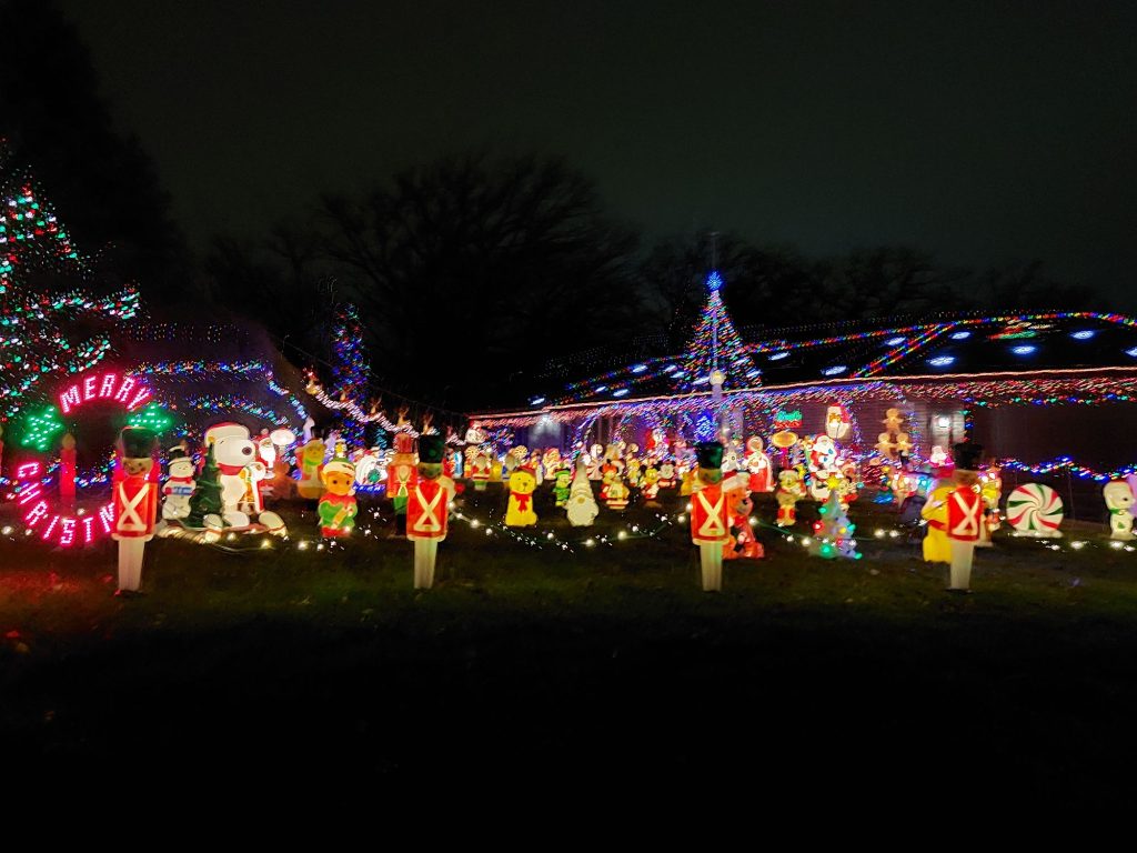 Today’s location is the Kenny Family Christmas Display at 16660 Patricia Avenue in Tinley Park, Illinois. More than 250 blow-mold figures, a flying Santa, 2,500 roof lights, and accompanying music.