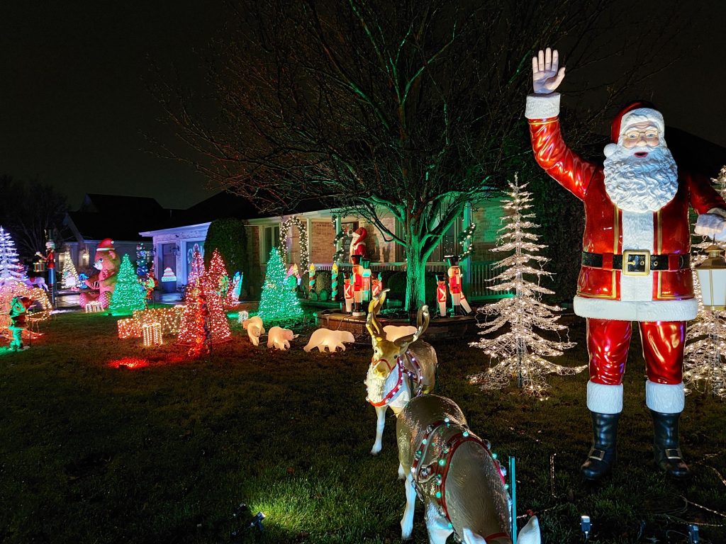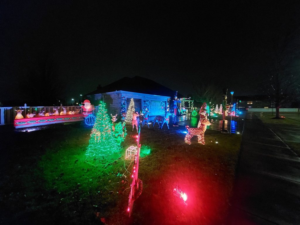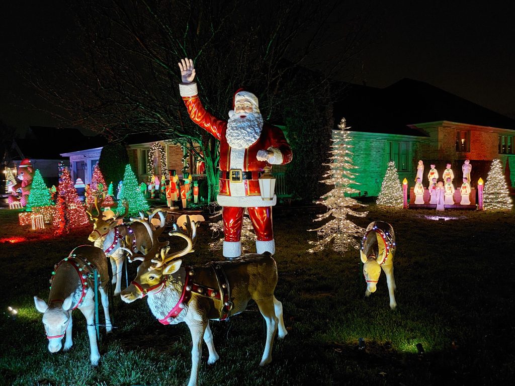 Today’s location is of the Yuletide on Cottonwood Drive in Tinley Park, Illinois. A display that includes Santa, reindeer, a nativity scene, and a lot of other stylish displays,along with the lighting and other elegant decorations.