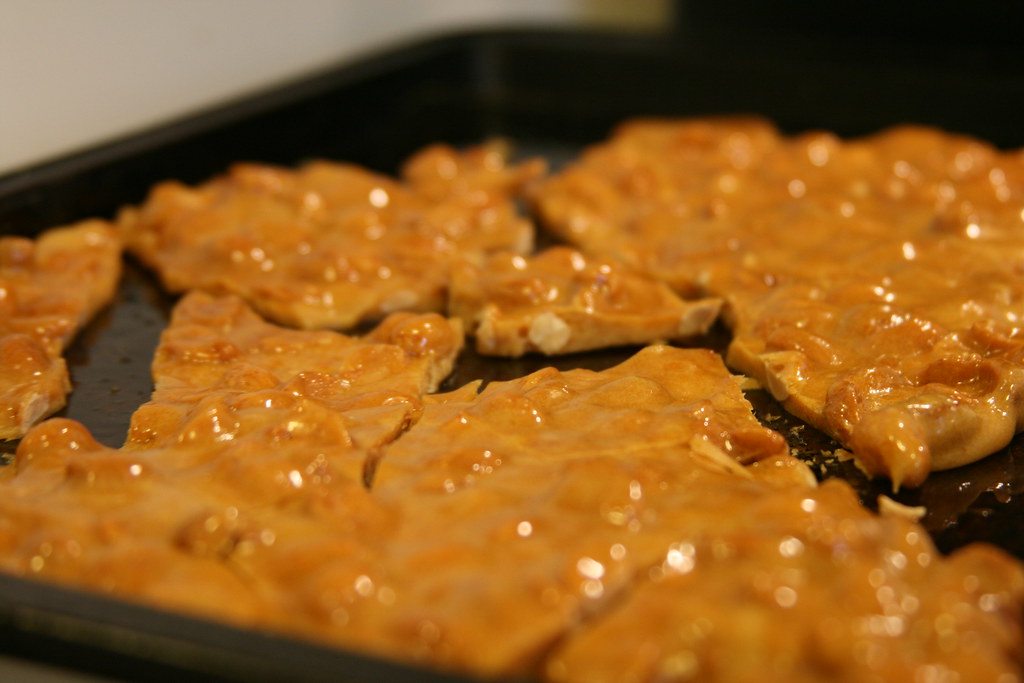 Golden peanut brittle cracked on a serving dish courtesy of Openverse