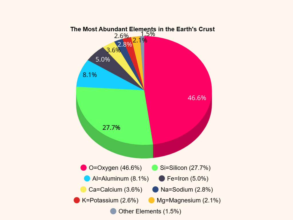 O=Oxygen (46.6%), Si=Silicon (27.7%), Al=Aluminum (8.1%), Fe=Iron (5.0%), Ca=Calcium (3.6%), Na=Sodium (2.8%), K=Potassium (2.6%), Mg=Magnesium (2.1%), Other Elements (1.5%)