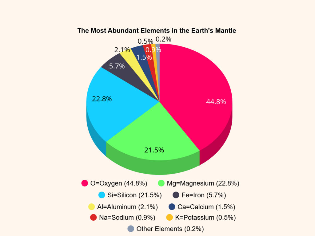 O=Oxygen (44.8%), Si=Silicon (21.5%), Mg=Magnesium (22.8%), Fe=Iron (5.7%), Al=Aluminum (2.1%), Ca=Calcium (1.5%), Na=Sodium (0.9%), K=Potassium (0.5%), Other Elements (0.2%)