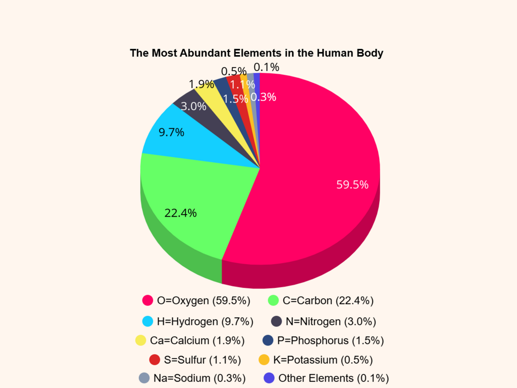 O=Oxygen (59.5%), C=Carbon (22.4%), H=Hydrogen (9.7%), N=Nitrogen (3.0%), Ca=Calcium (1.9%), P=Phosphorus (1.5%), S=Sulfur (1.1%), K=Potassium (0.5%), Na=Sodium (0.3%), Other Elements (0.1%)