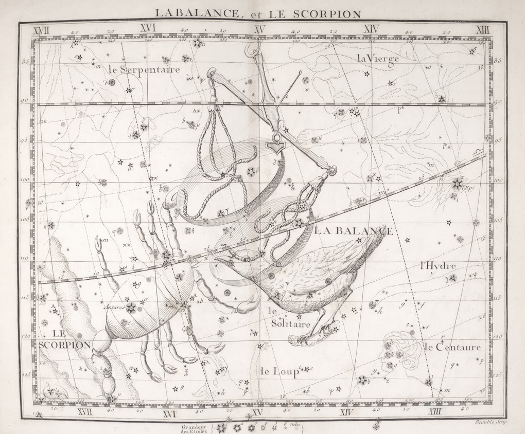 Libra, “The Scales” – The Libra constellation is located in the southern hemisphere, and symbolizes “the scales.” Libra was first listed by the Greek astronomer Ptolemy in the 2nd century. Its name means “the weighing scales” in Latin. Unlike other zodiac constellations, Libra represents an inanimate object. Its four brightest stars form a quadrangle, with Alpha and Beta Librae as the balance beam and Gamma and Sigma Librae as the pans. Libra’s brightest stars shine at third magnitude and include Zubeneschamali and Zubenelgenubi. It is also home to the ancient Methuselah Star and another even older star.