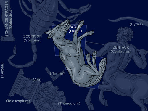 - Mythology: The stars that currently constitute the constellation Lupus were once part of the Centaurus constellation. They symbolized a sacrificed animal that was impaled by the centaur, who was presenting it towards the constellation Ara, the altar. This constellation did not have a specific animal association until the Renaissance period, when the Latin translation of Ptolemy’s work linked it to the wolf. The Greeks referred to the constellation as Therium, meaning a wild animal, while the Romans named it Bestia, the beast. During Greek antiquity, the constellation was likely interpreted as a creature inspired by the Babylonian depiction of the Mad Dog. This creature was a hybrid, possessing a human head and torso, along with the legs and tail of a lion. It was often connected with the sun god and Bison-man, another mythological being, and was designated as UR.IDIM, where UR denoted a large carnivore, potentially a lion, wolf, or dog.