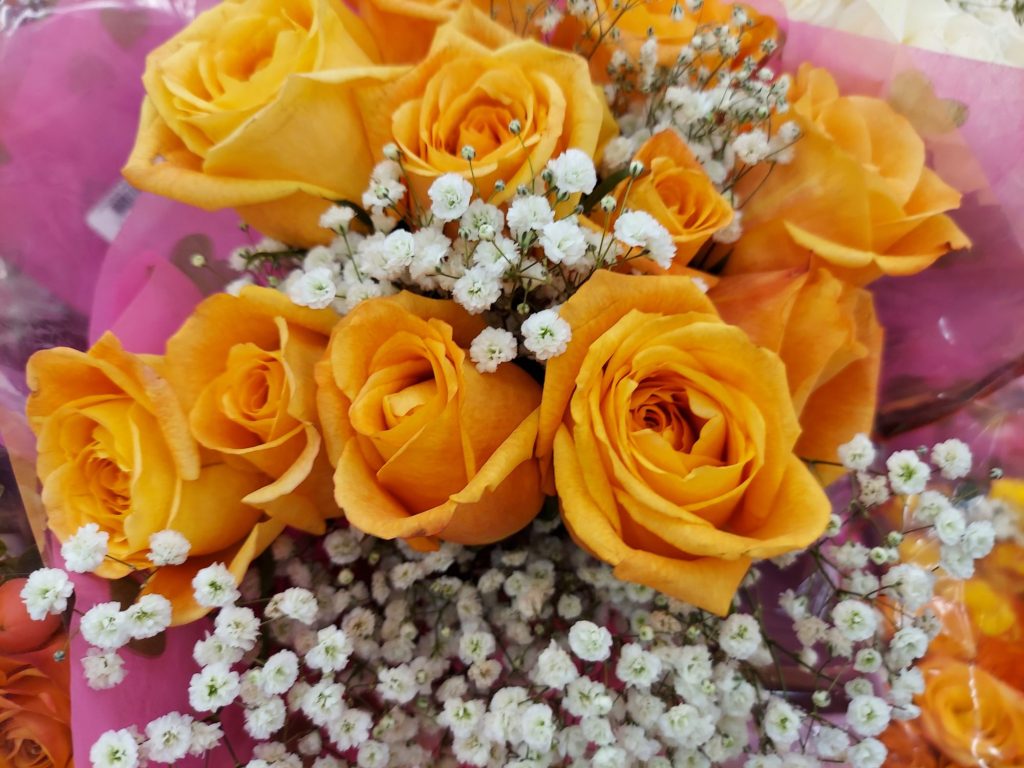 Here is today’s featured photo flower bouquet presentation. To let 2025 shine bright, I am featuring fine photos of flowers, continuing to honor the brighter side of life once again this year. Every week, I am featuring a special bouquet of flowers. Here is this week’s presentation, a combination of nice, bright mix and anytime flowers: An assortment bouquet including an assortment of Orange Roses featuring with classic white Baby’s Breath (Gypsophila) to continue July after the holiday feature! – July, Week #2.
