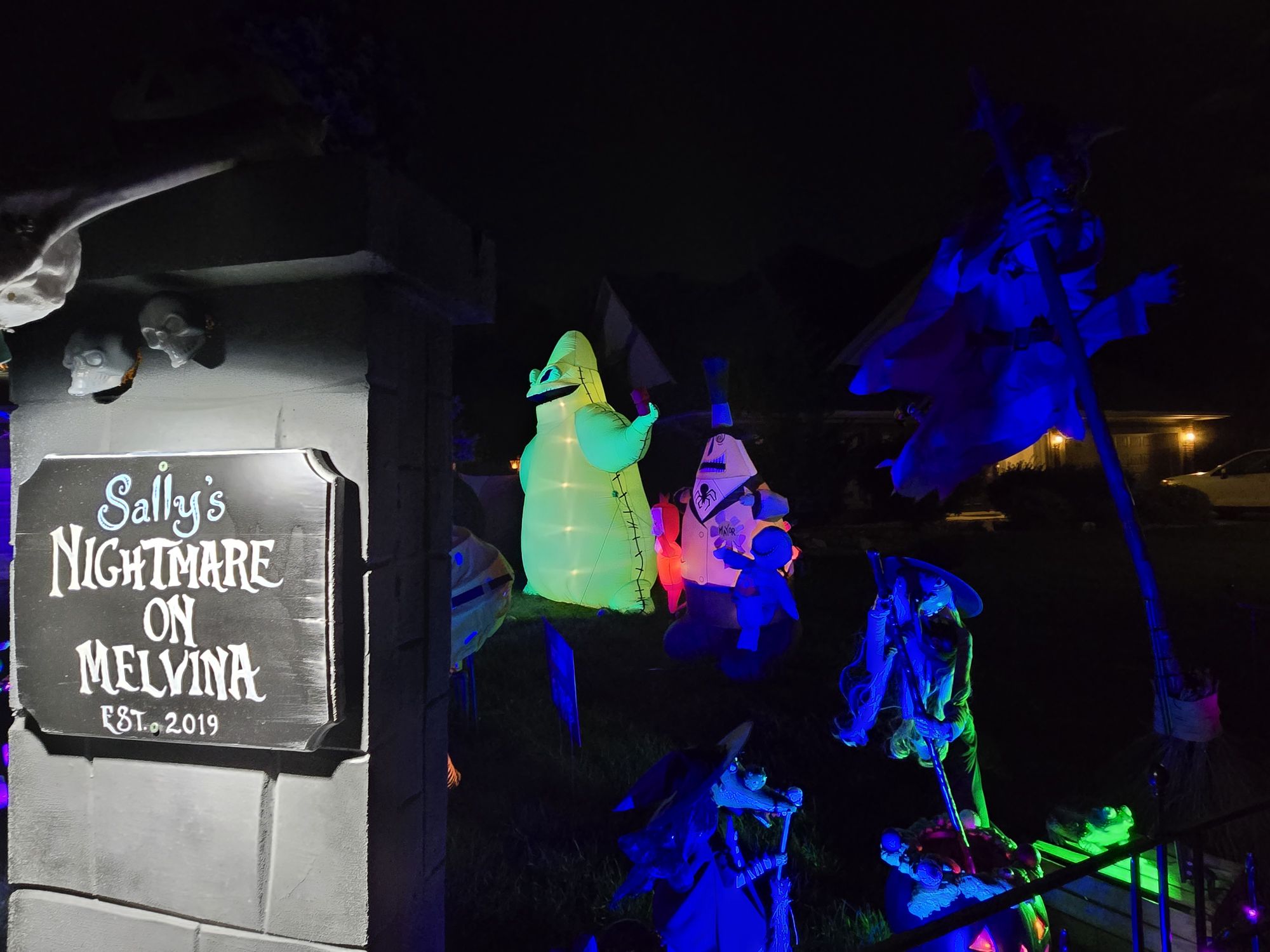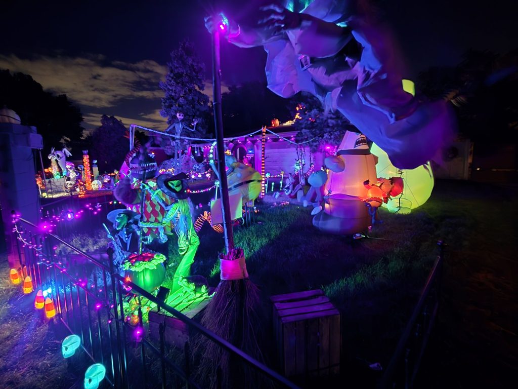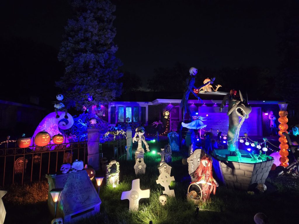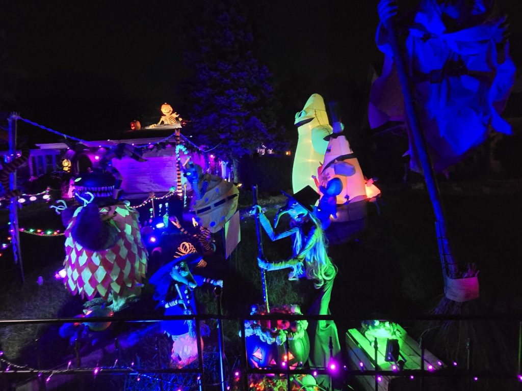 A Nightmare before Christmas family friendly yard display, Featuring projections and many handmade animated characters from the film.