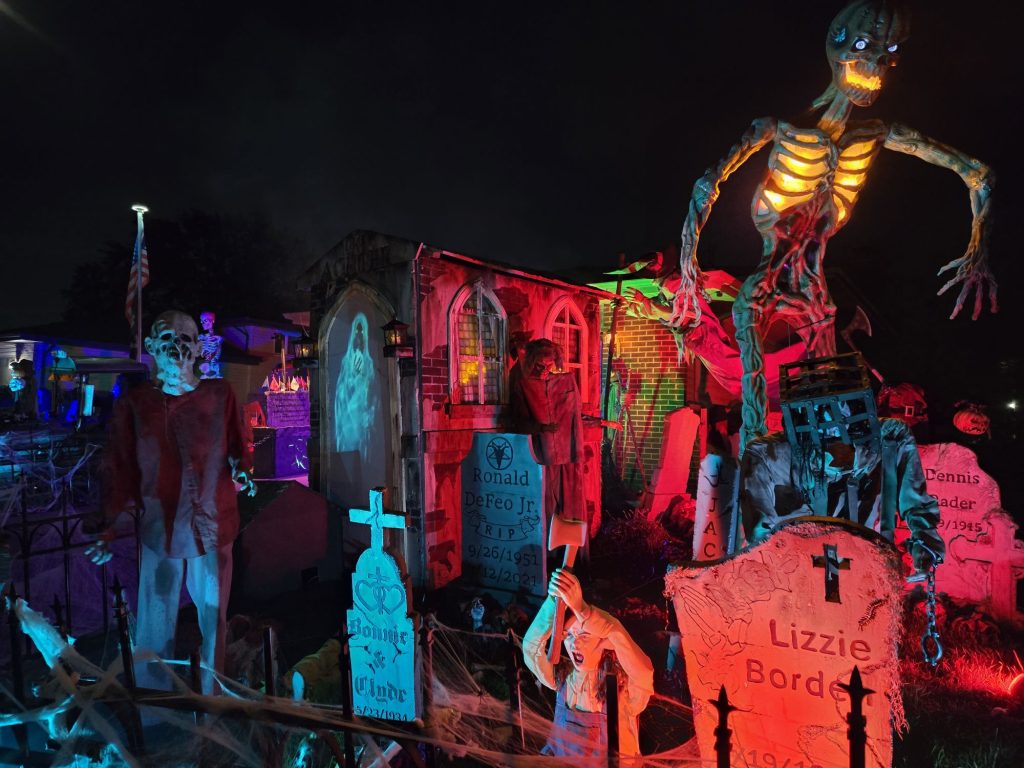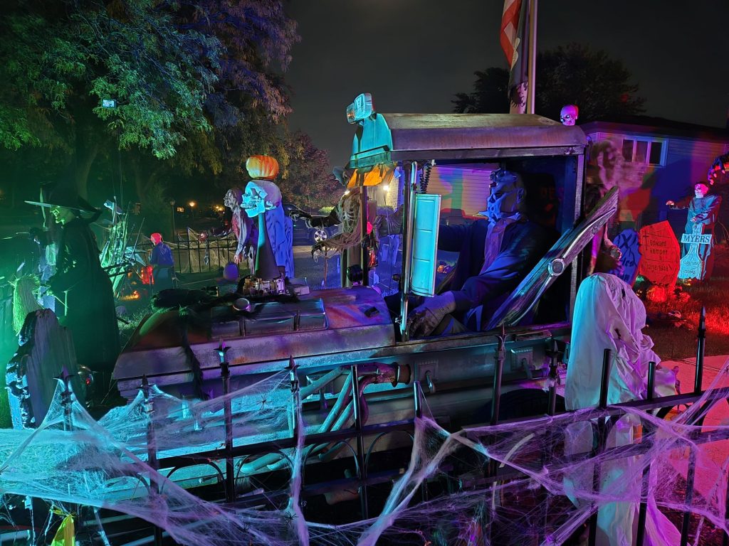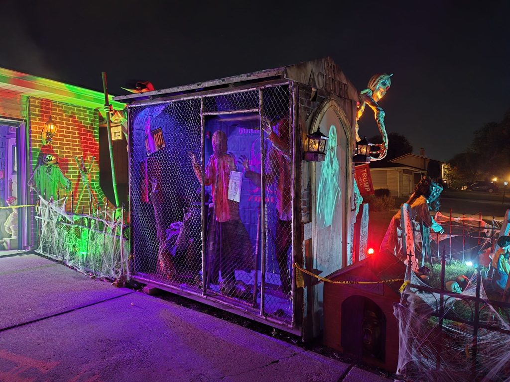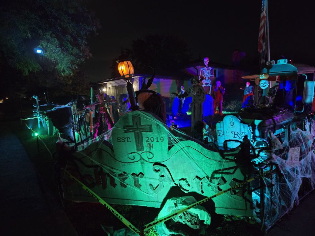 Display w/lit props including Smoke, ghouls, tombstones, and various lighting scenarios. Just a good time yard display!