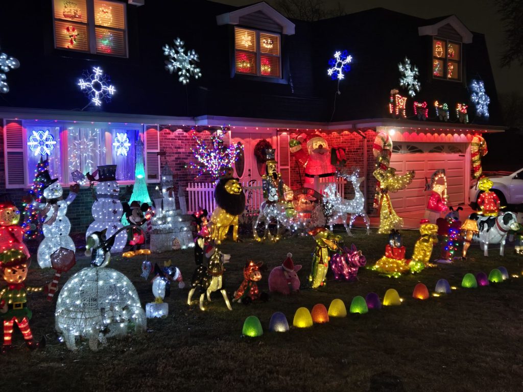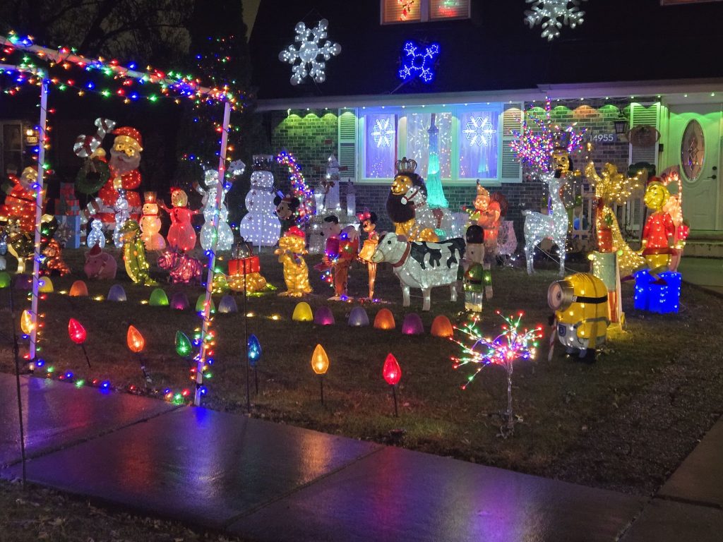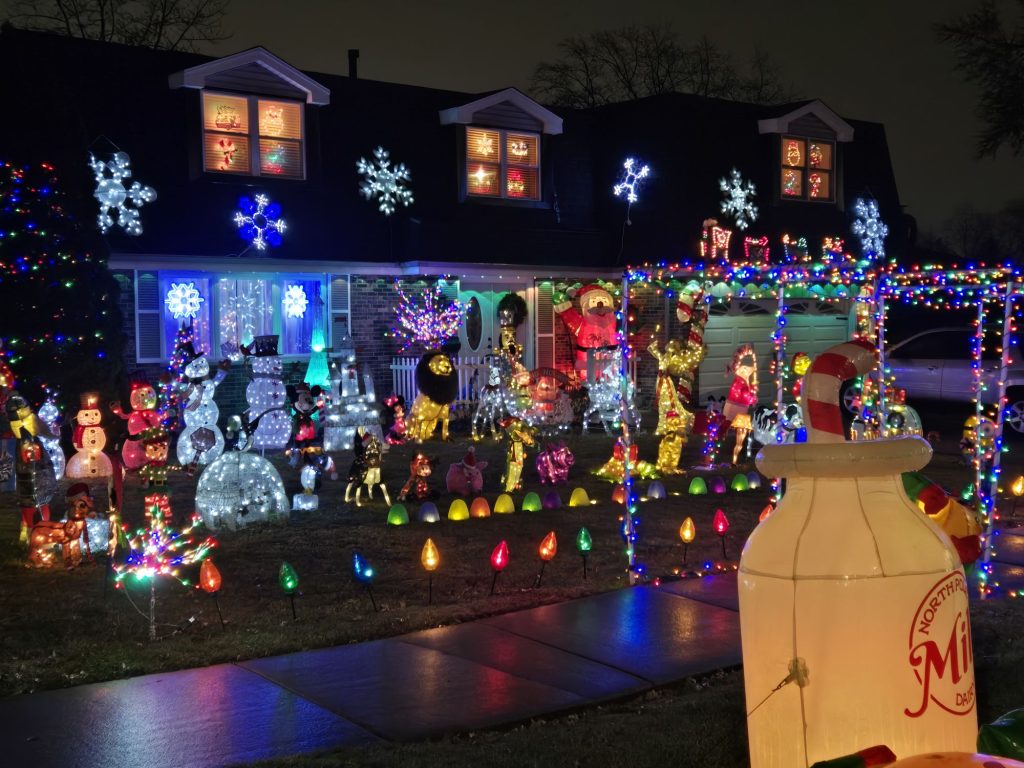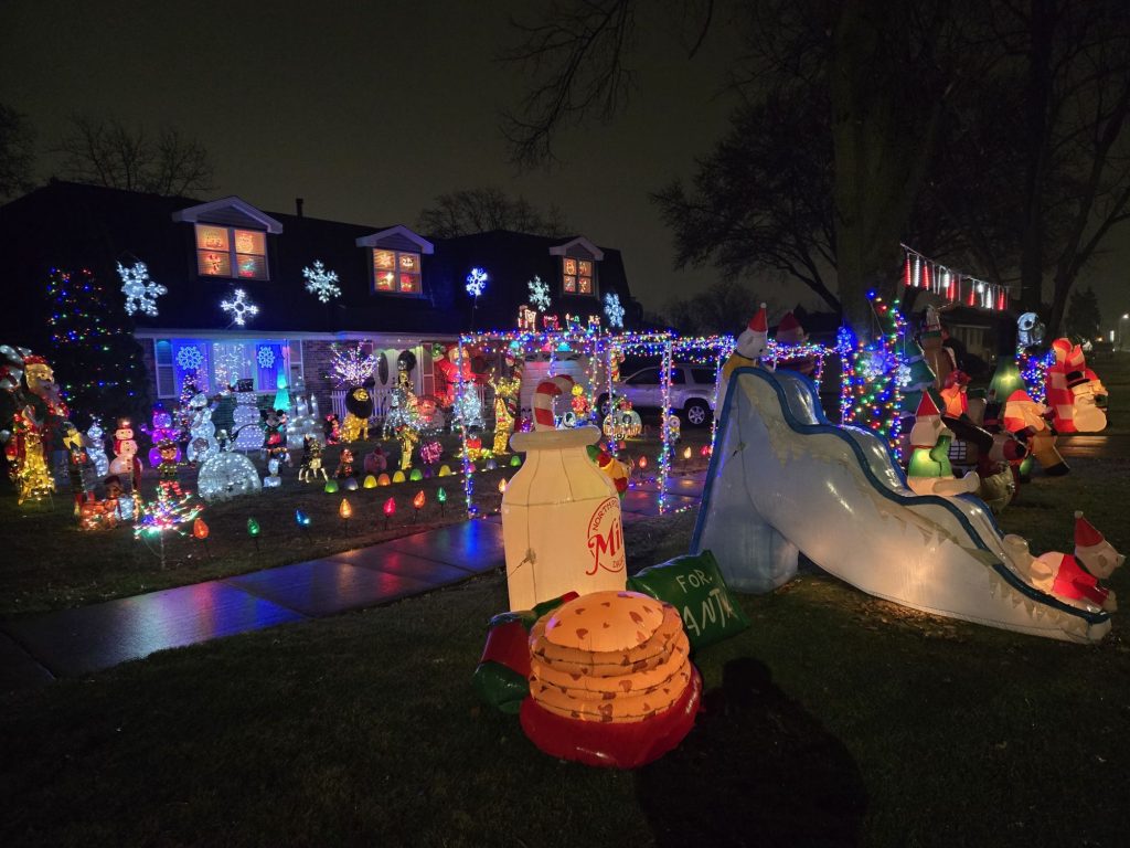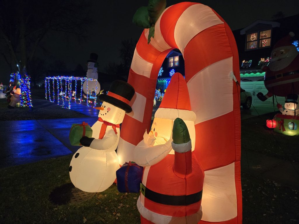 Today’s location is Yuletide with the Pastrnak is More Than Candy Canes at 14955 West Avenue in Orland Park, Illinois. Mark Pastrnak showcases an impressive collection of inflatables in his vibrant display, featuring Santa aboard a ship, riding a motorcycle, descending a slide, and even riding an elephant, along with the Blessed Mother and a stunning assortment of lights.